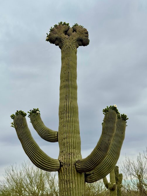Walking to close to the saguaro gave us a newfound appreciation for just how enormous they can grow to be! These cacti can live up to 200 years and grow as tall as 50 feet with up to 24 arms branching off. Some, called cristates, have fan-like growths at the top. Scientists are not sure why…lightning? freeze? abnormality? Regardless, they are very cool to spot.