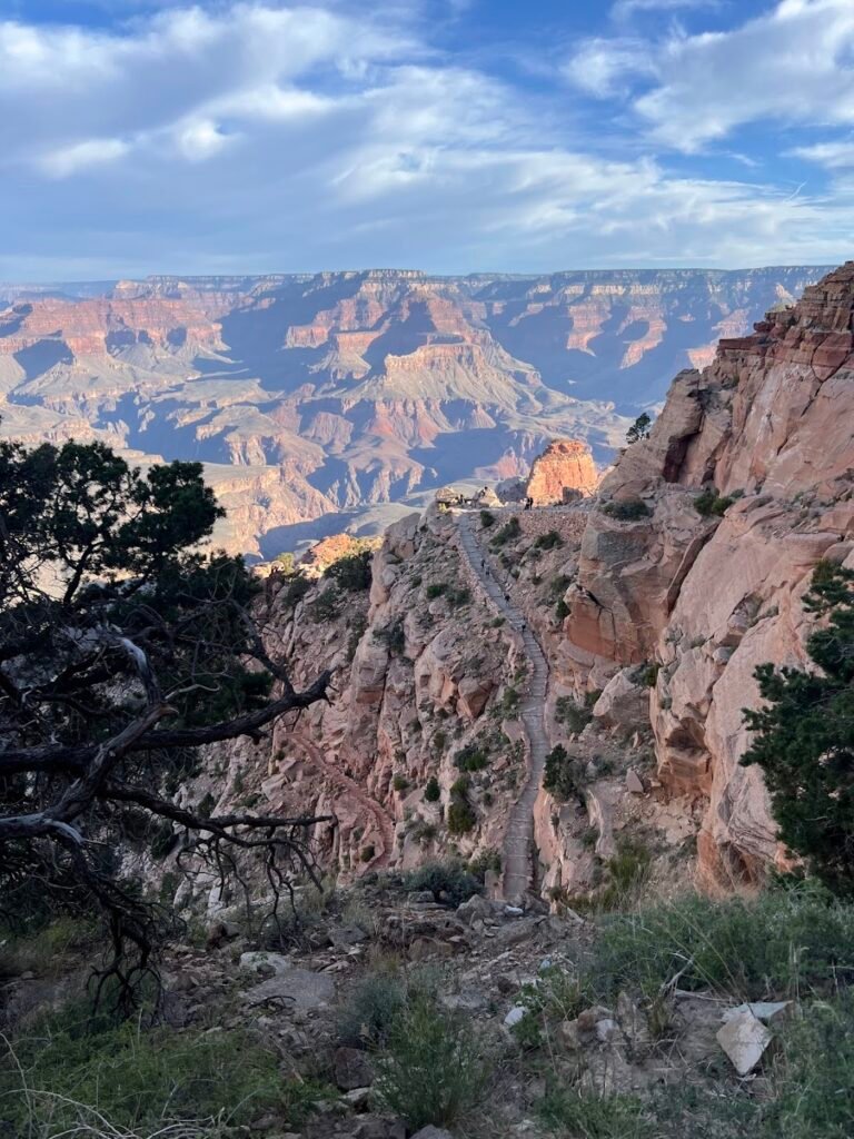 South Kaibab Trail at sunrise is sublime. After hiking so many miles the previous days, this <1-mile trail was a joy. Although we descended and then ascended almost 700 feet, the payoff vs. hiking effort was strong. The trail was in great shape with numerous switchbacks to help lessen the burden of the climb. We can’t think of a more perfect name than Ooh Aah.