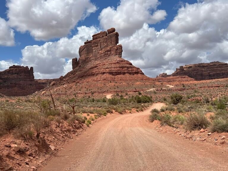 Valley of the Gods is another scenic, 17-mile drive on a graded gravel and clay surface road. The road may be suitable for passenger cars when the conditions are dry, but we’d still recommend a 4×4. The road runs between Highways 163 and 261, and we entered from the west, just a short drive from Goosenecks State Park.