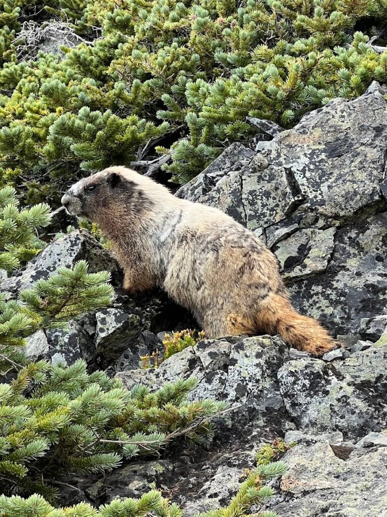 We then set off down trail and retraced our steps to the junction, this time veering onto the Burroughs Mountain Trail at Frozen Lake. Along the way we had a fantastic marmot sighting. Look at that furry little guy!