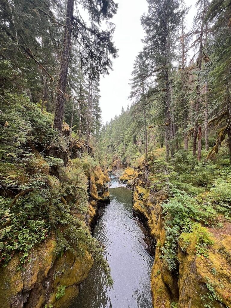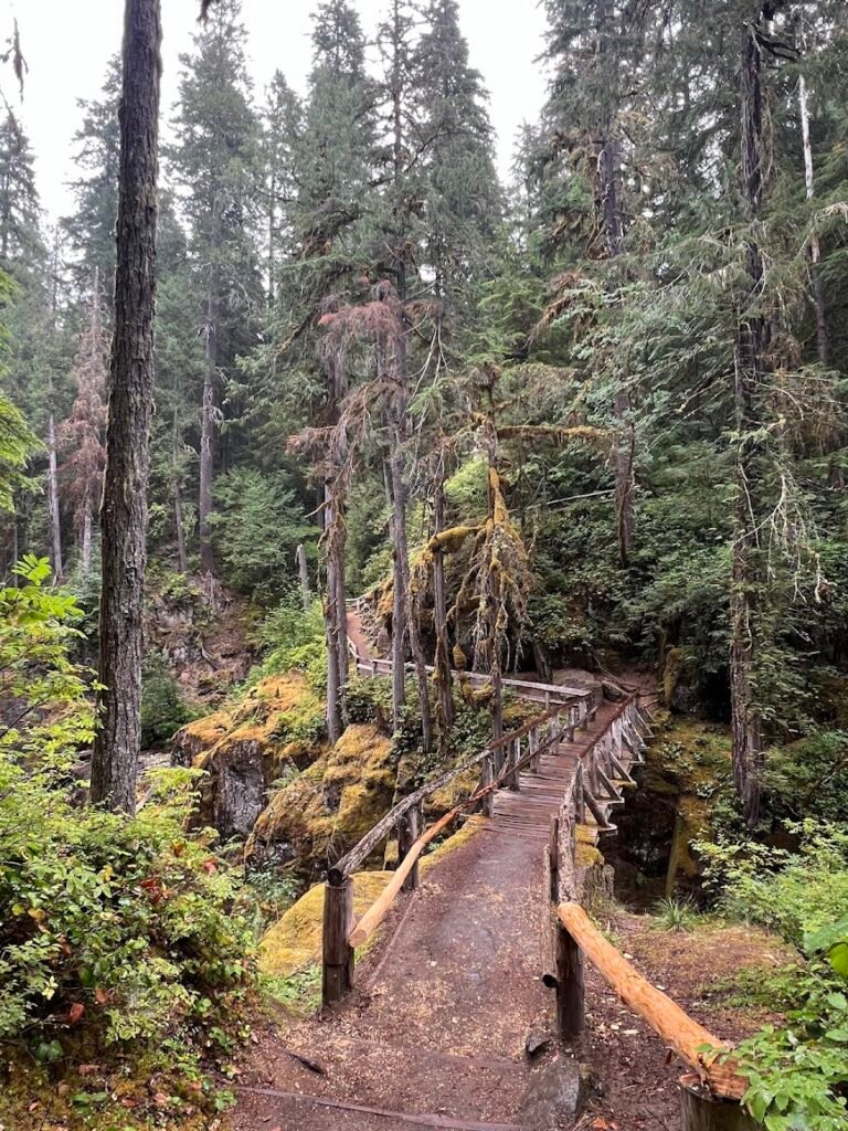 Hiking to Silver Falls is another great, short, rainy day hike. The trail took us upstream along the impressive Ohanapecosh River through a lush green forest. At the end of our loop, we crossed a log bridge over the river and reached the falls tumbling over a series of rocks. As the standard trailhead for this hike was closed, we had to detour off-route so our hike came in at 2 miles and 330 feet of elevation gain, taking us about one hour to complete.