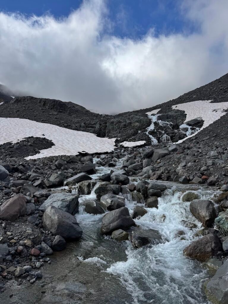 4 miles into the trek we reached Camp Summerland, set amongst a beautiful meadow of wildflowers. Here the clouds briefly parted as we paused for a snack and then pressed on. Turning one corner on the trail led us into a starkly different world. Instead of lush green meadows, we found ourselves hiking through a maze of black boulders and gravel, over the rushing melt water streams and snowfields.