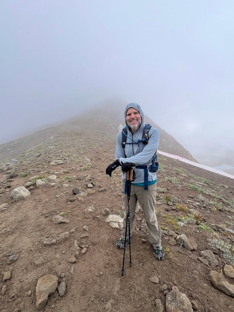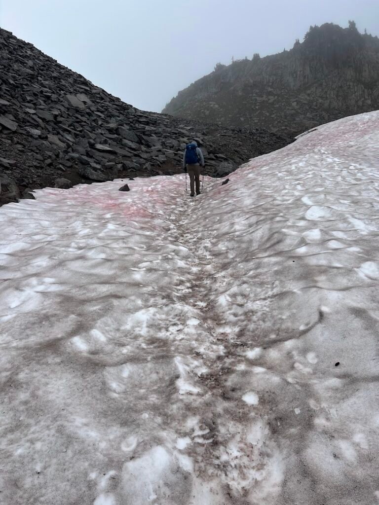 Despite hiking in August, as we approached the final push to Panhandle Gap, we put on our microspikes for extra traction up the slippery snow. There are reputedly views of Mount Adams and even Mount Hood in Oregon on a clear day, but we saw none of it! We waited around in the gap to see if the clouds cleared, but they never did so we headed down retracing our steps. We did catch a glimpse of mountain goats in the distance, one of the day’s highlights.