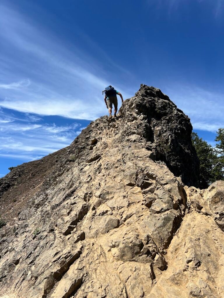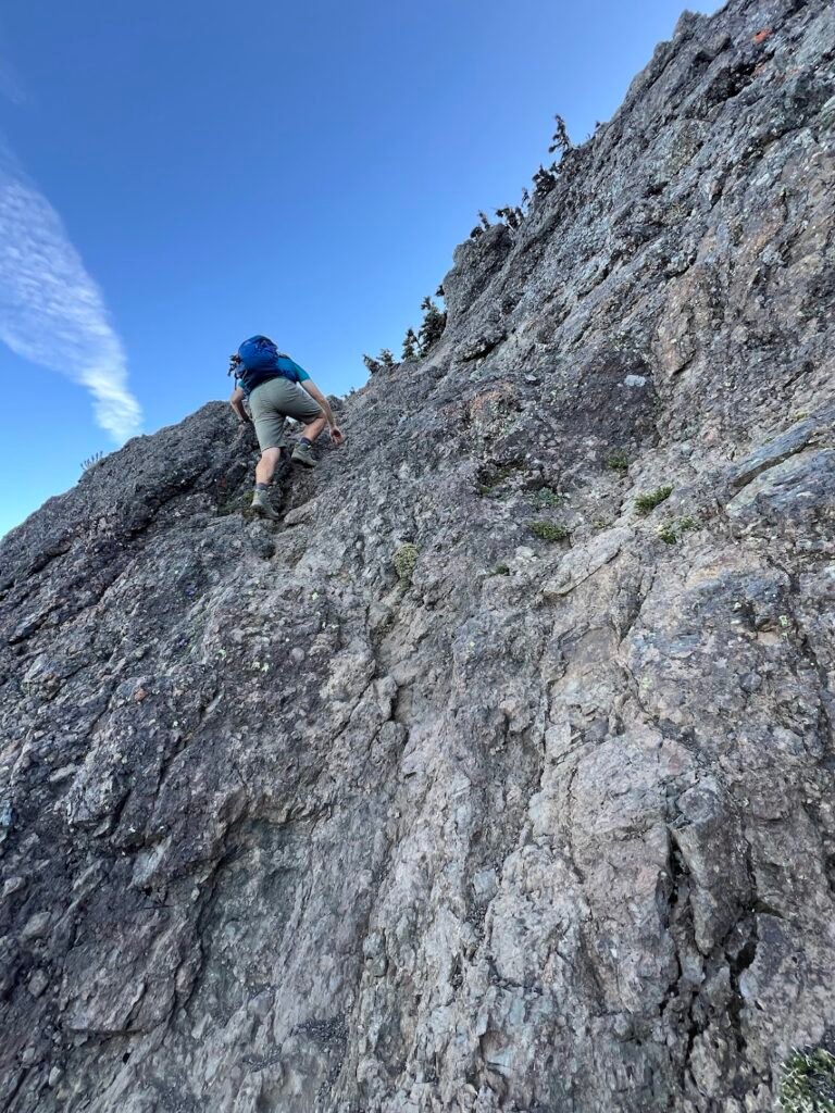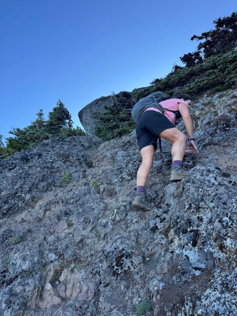 At about 2.5 miles into our hike, we came to a fork in the trail. Hiking to this point would be a great day in and of itself, but we veered left to head to the summit of Mount Angeles. The trail’s incline sharply increased and we climbed through meadows and subalpine forest before reaching the scree-strewn slopes of the mountain. The scramble up the rock and scree to the summit was no joke. Laughably, even with our map we had trouble finding the actual summit. It seemed to be just above us…but how to get there? Undeterred, Mike found a way up to the top, then coached me through what was at this point a rock climb. Yikes!