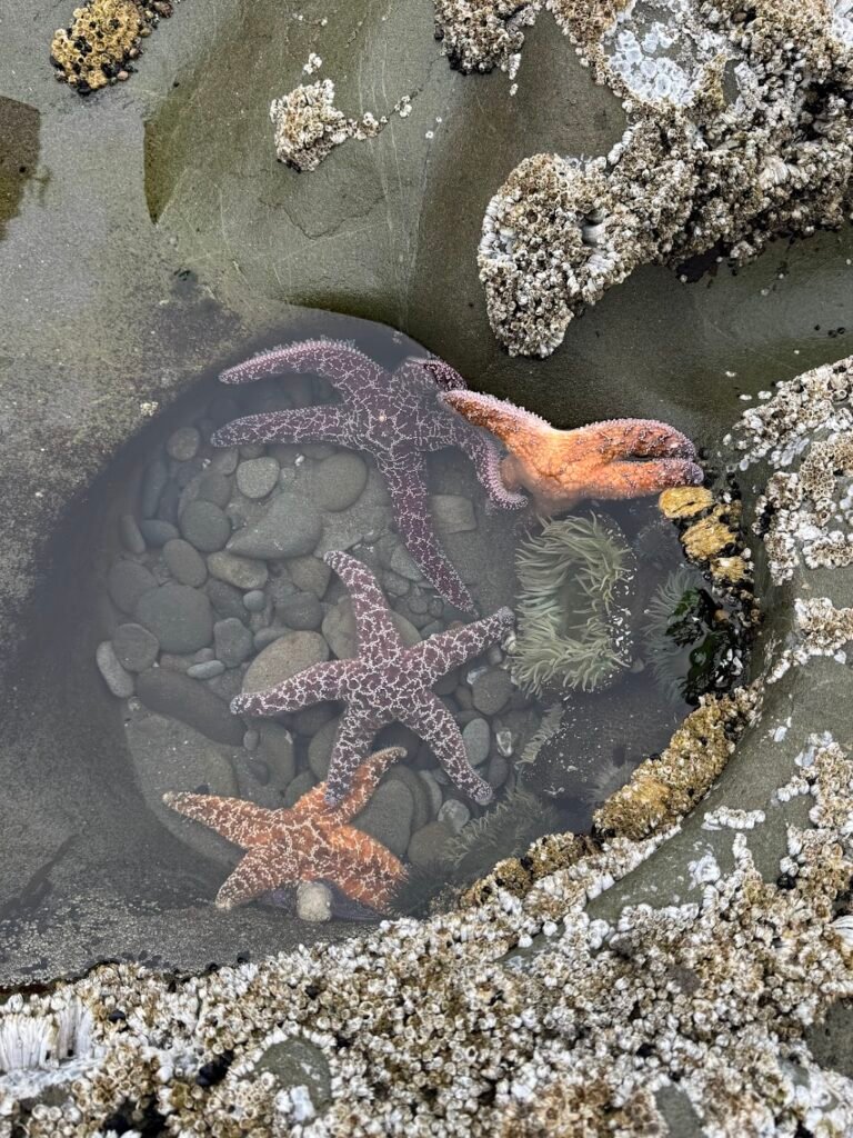 Access to Second Beach is a bit more interesting than some of the other beaches we visited because you must first walk through a small forest. You then descend to the beach via a set of switchbacked stairs (which can be slippery!). Once we arrived, through the still-heavy mist we got glimpses of the seastacks this portion of the coast is known for. A highlight here for us were the tidepools. We found several that were filled with colorful starfish and sea urchins.