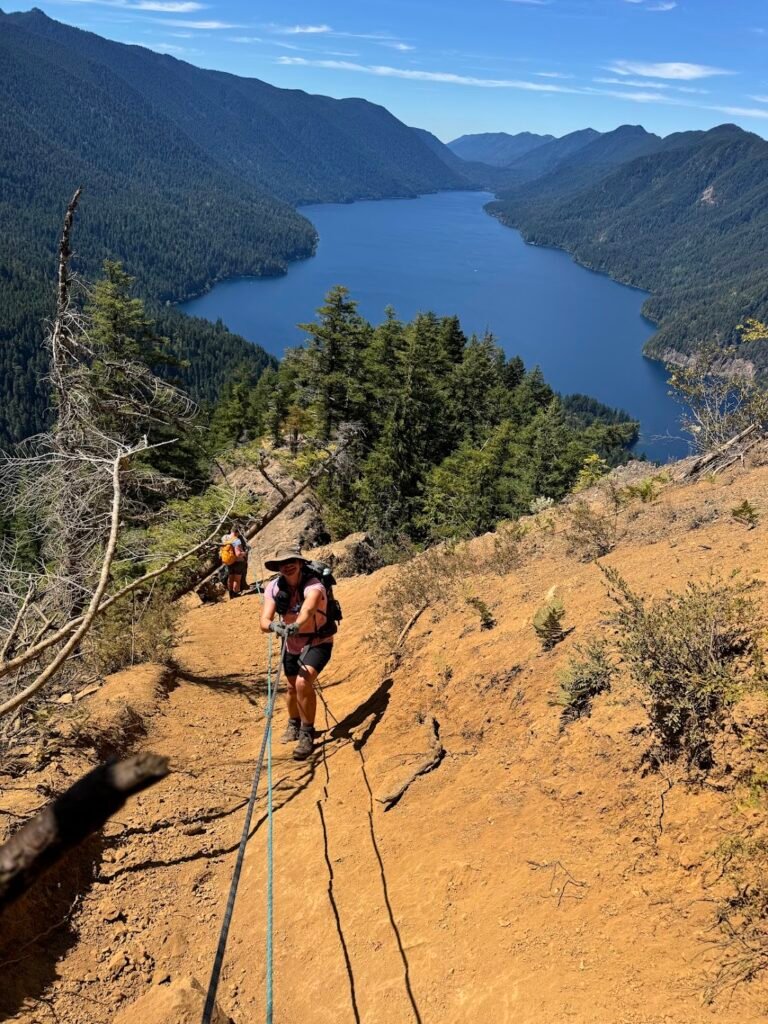 The trail wound through forest with trees that made us feel impossibly small in the best way possible. We marveled at Sol Duc Falls and the surrounding, Jurassic-like ferns before arriving at Deer Lake. From here, we were on the High Divide Trail. Under clear blue skies we couldn’t stop gawking at the distant glacier-laden mountains. We even saw a bear foraging on the green slopes far below.