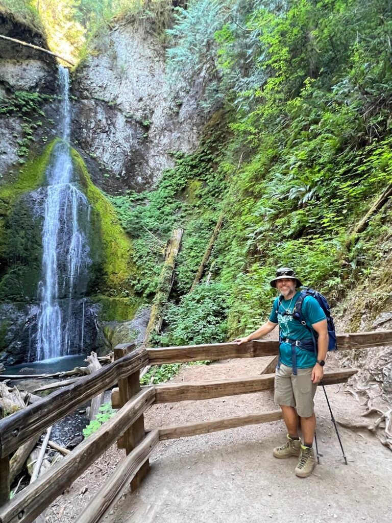 The trail culminated at a loop, offering two viewpoints: a lower platform provides a view directly opposite the base of the 90-foot-high waterfall, and the other is on the hillside looking down on the falls as they plunge through a notch in the cliff. Despite being so short and easy, the trail to Marymere Falls ended up being one of our favorites in Olympic. Our hike took 3 hours and 20 minutes covering 5.2 miles and 2,360 feet of elevation gain.